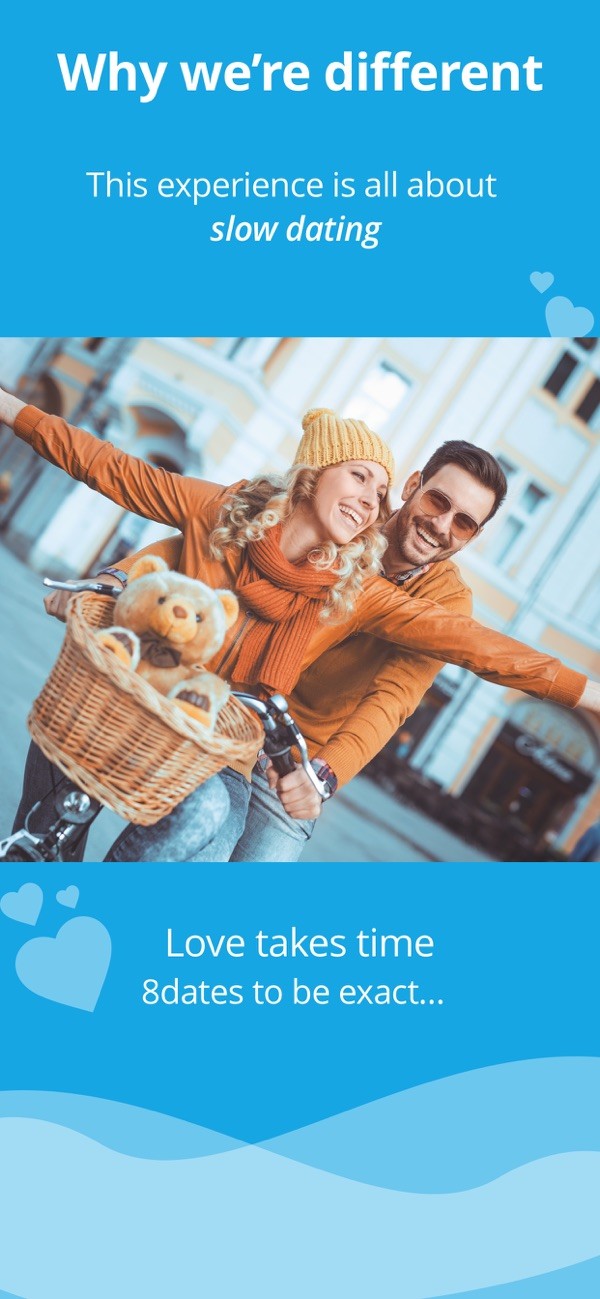 8dates is designed to slow the dating process down by empowering the couple to control the flow of how the relationship develops. We built this app with one thing in mind; bring chivalry back to dating and create a safe, slow, and fun environment that has one goal, finding the perfect match.