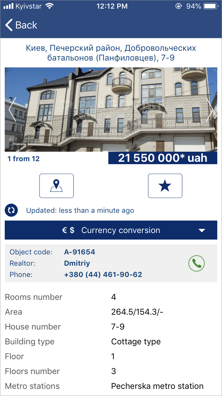 All object details with images, prize, currency conversion, detailed description, contact data of Real Estate Agent.