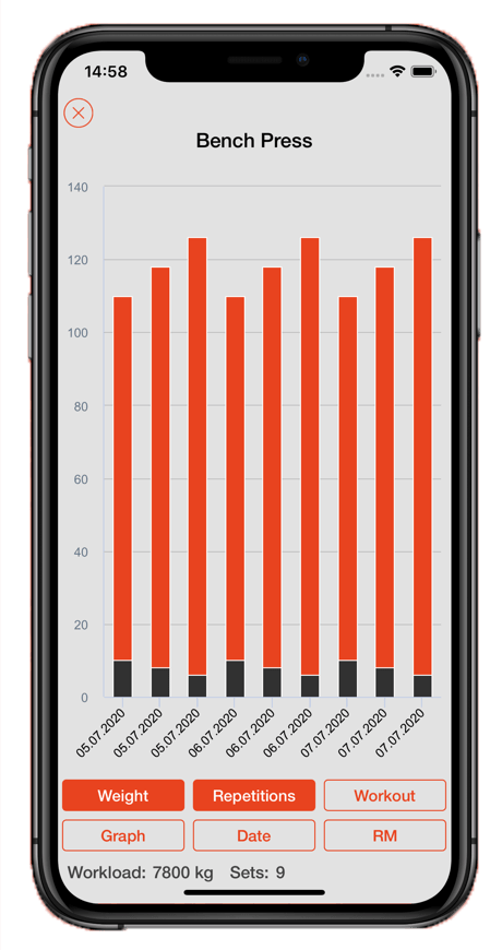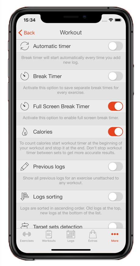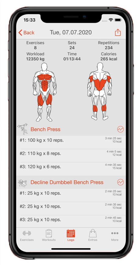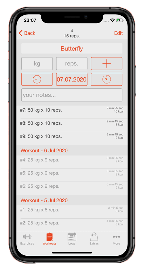 Workout logs saving kg, reps and time. You can switch between regular and time exercises’ logs.