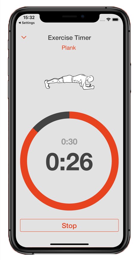 Applications has 2 types of exercises: regular and time exercises. Timer will indicate both exercise time and break time.