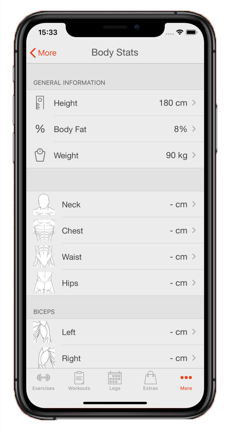 Setup your body profile to enable exercise logs and other useful app features. Body stats are synchronized and saved in iOS Health app.