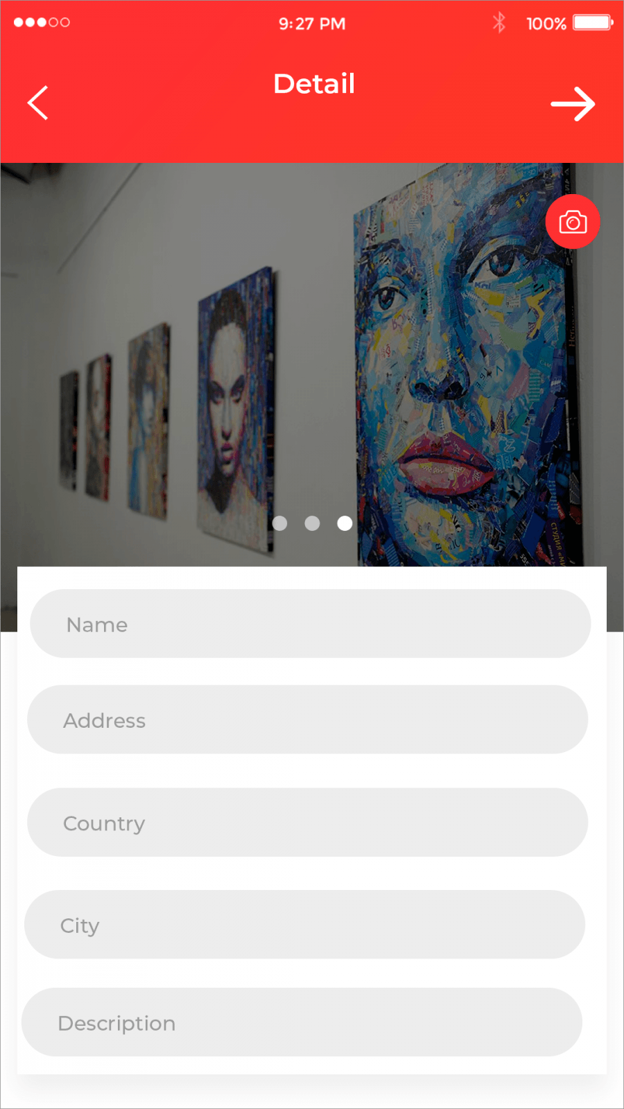 On this screen user fills all info he knows about the object: name. images, description, country, city, address.