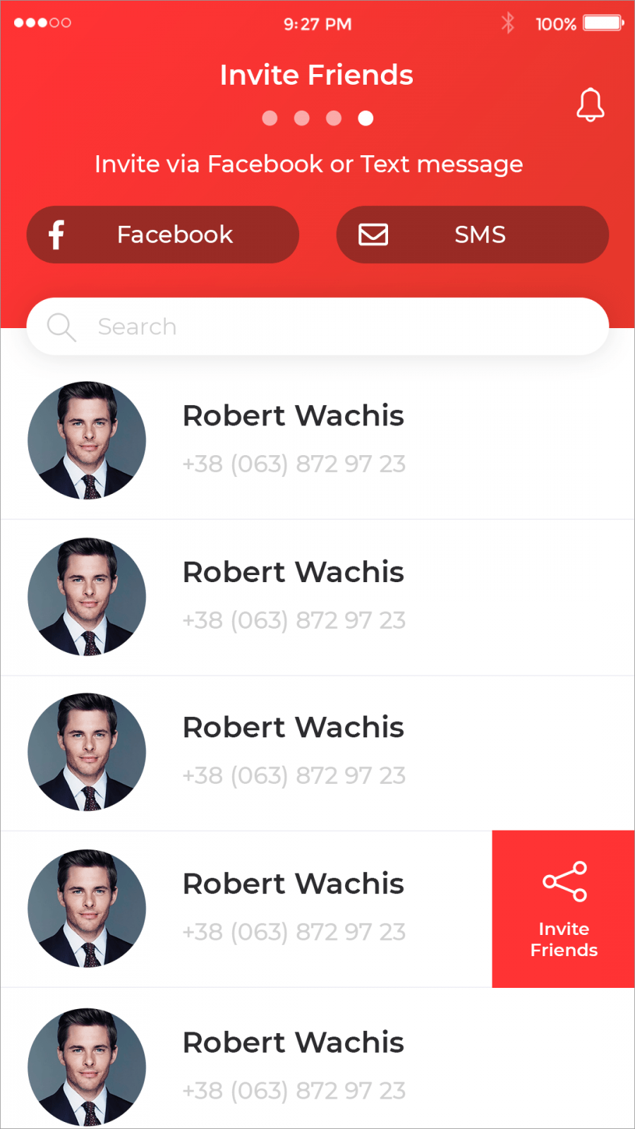 Application shows user contacts and allows to invite any friend from contact list and from Facebook.