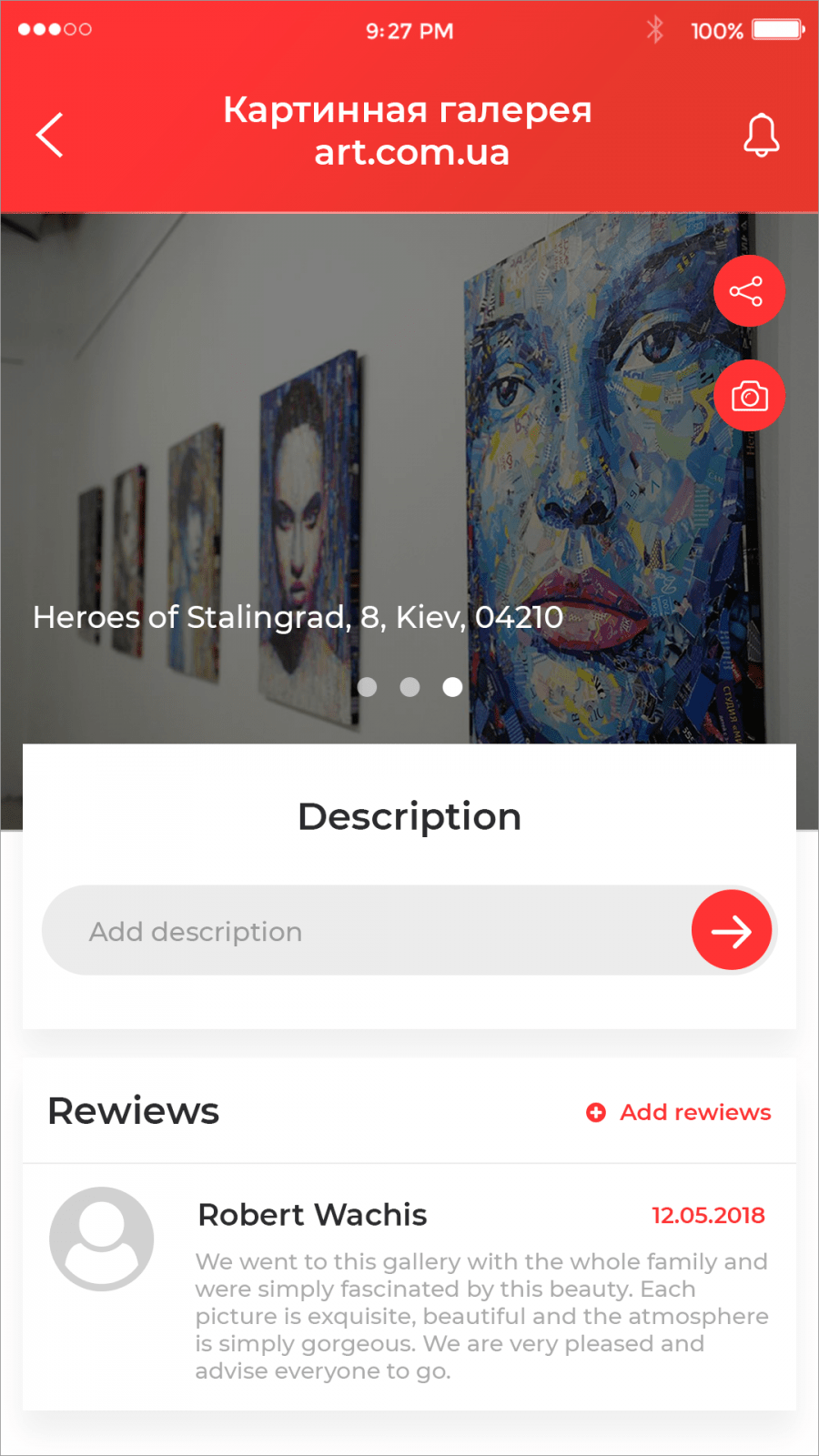 User can see and edit all object details: name, images, address, description, reviews.