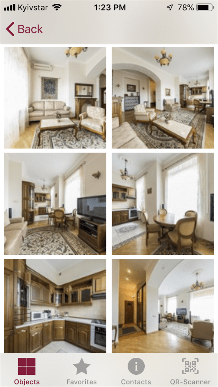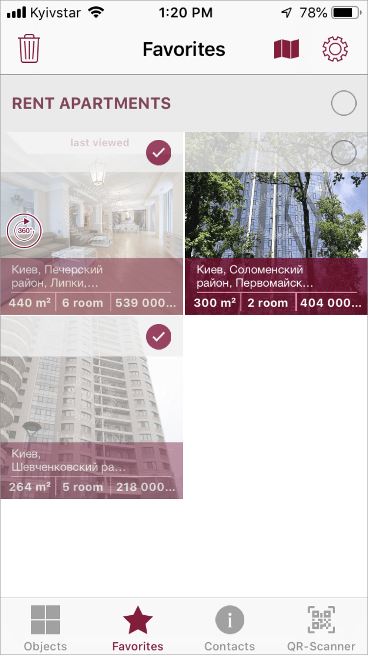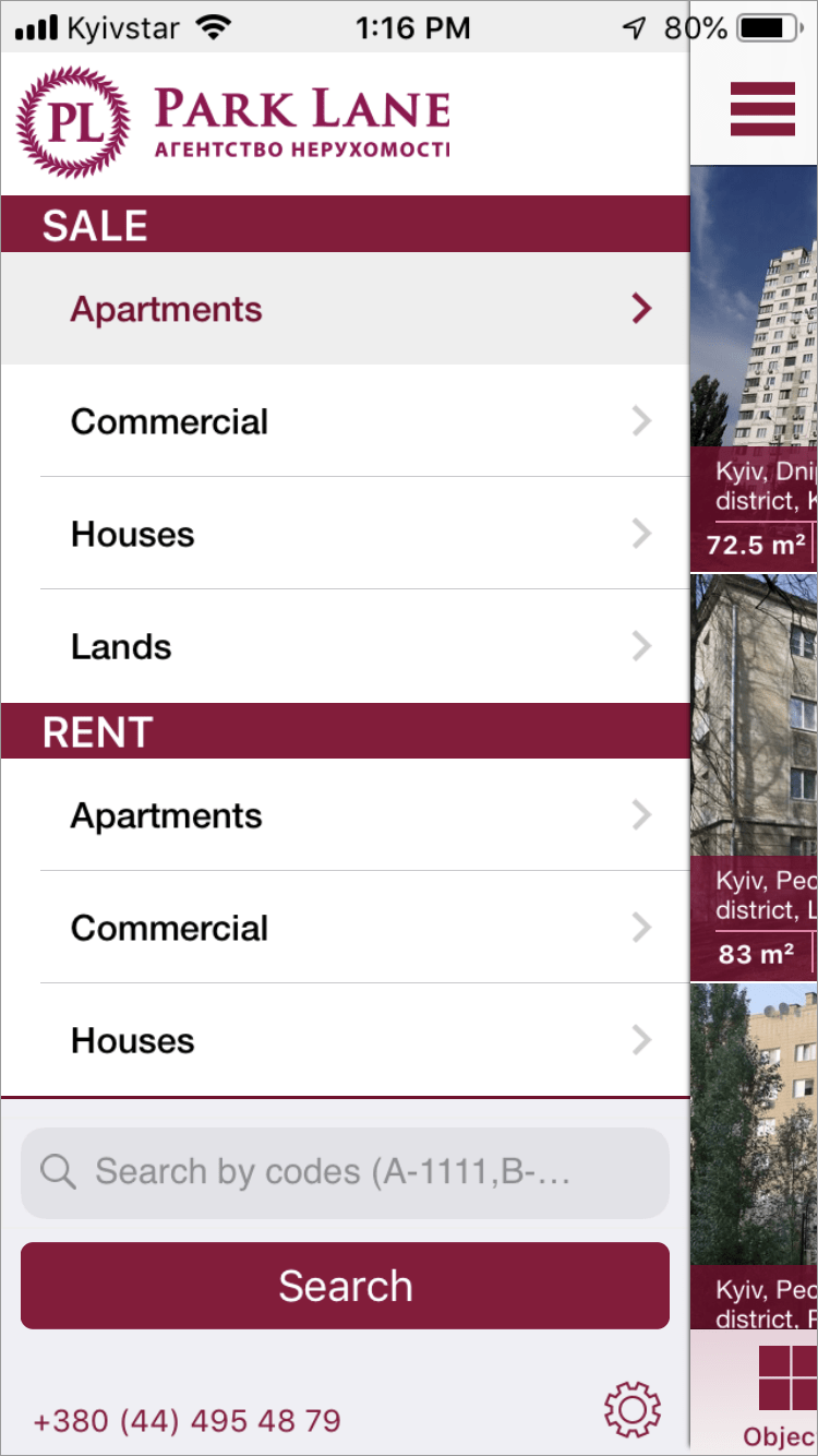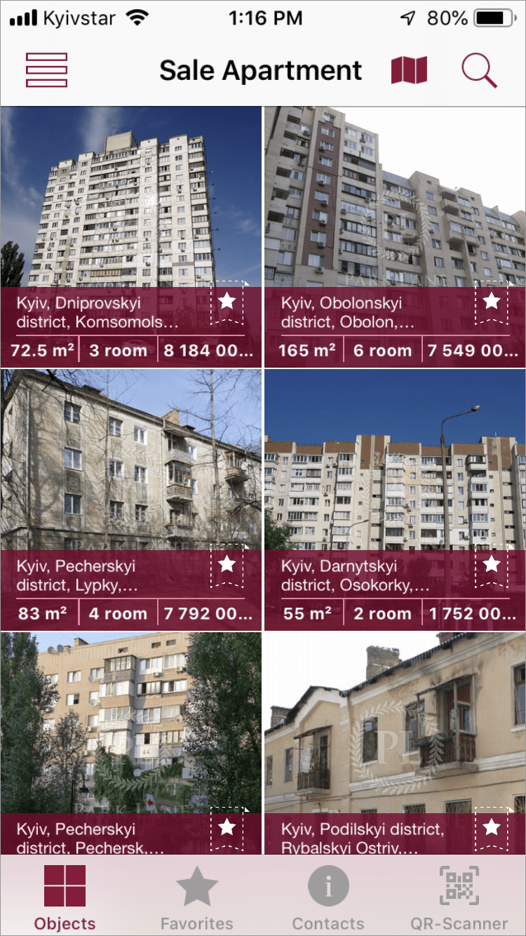 Список об’єктів, доступних для оренди або продажу, із зображеннями, квадратами і цінами.