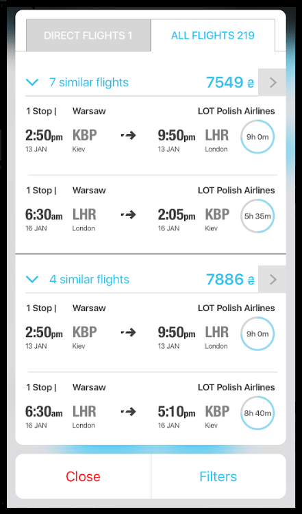 Щоб знайти квиток, вам необхідно вказати аеропорт вильоту, місто прибуття і, звичайно ж, вибрати бажану дату. Quicket шукає всі відповідні рейси близько хвилини, а потім видає їх, сортуючи від найдешевшого до найдорожчого. На екрані також відображається час у дорозі, час відправлення та пересадки, якщо такі є.