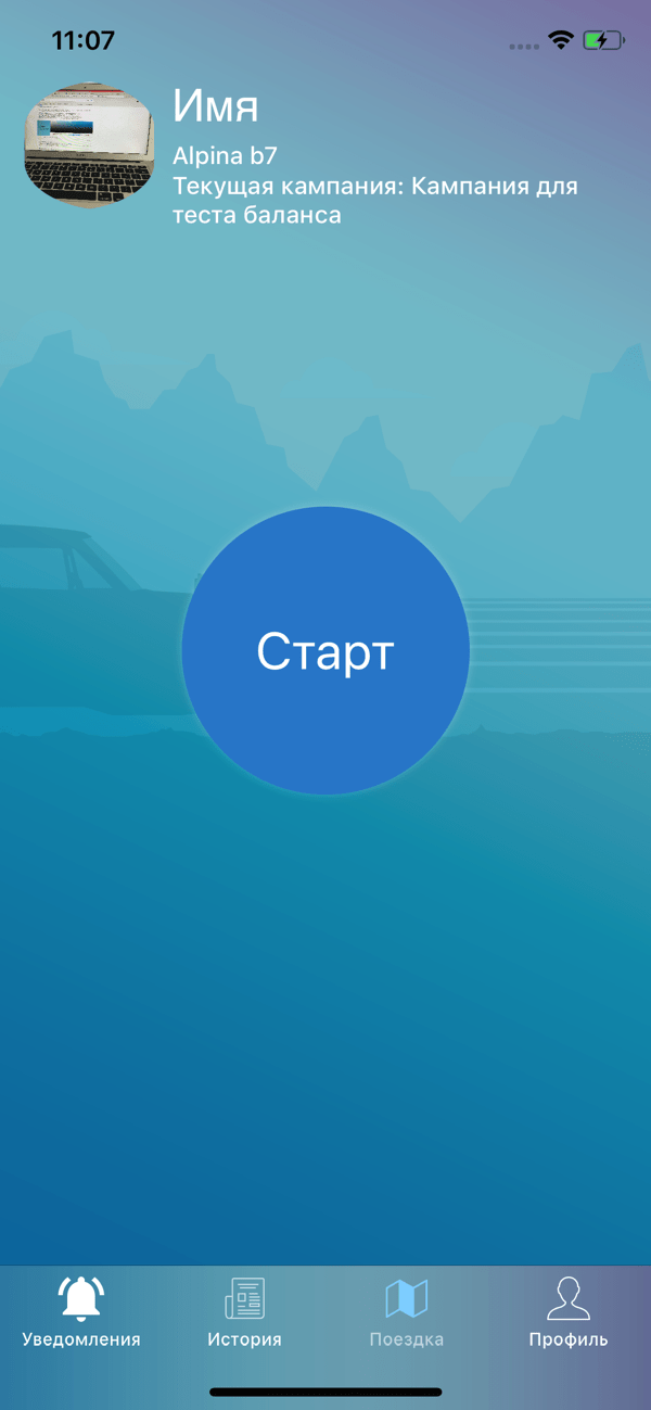 Головний екран з ім’ям користувача, моделлю автомобіля, фото і поточною кампанією. Кнопка «Старт» активує нову поїздку і підраховує зароблені гроші в залежності від пробігу, району міста, статусу автомобіля і часу доби.
