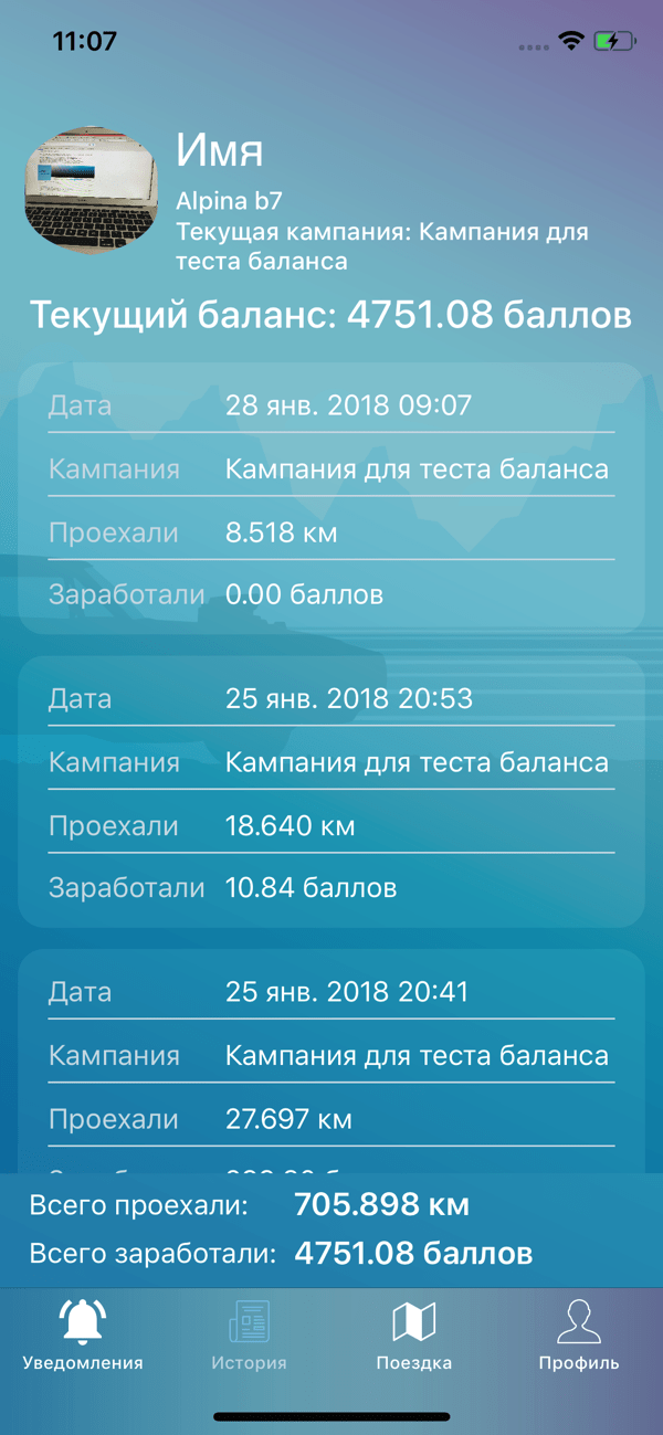 Історія поїздок з докладною інформацією про кожну поїздку: дата, кампанія, пройдений кілометр і витрачені гроші. Внизу екрана відображається загальний пробіг і витрачений пробіг.